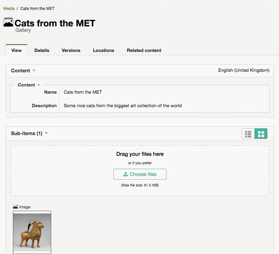 You can now create collections of content quickly: upload multiple files in bulk and they will be imported directly into the content repository. The files will automatically be imported as content using the content type that matches their MIME type. Go to the content view, drag and drop or select multiple files in the sub-items area and you will get direct access for further editing. As ever, this solution can be customized so that you create your own matching rules.